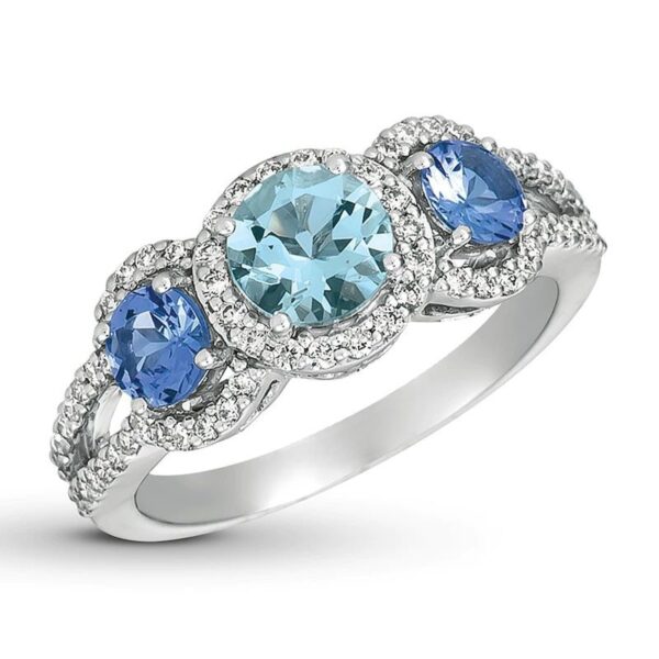 6.0mm Blue and White Sapphire with 1/8 CT. T.W. Diamond Three Stone Bridal Set in 10K White Gold