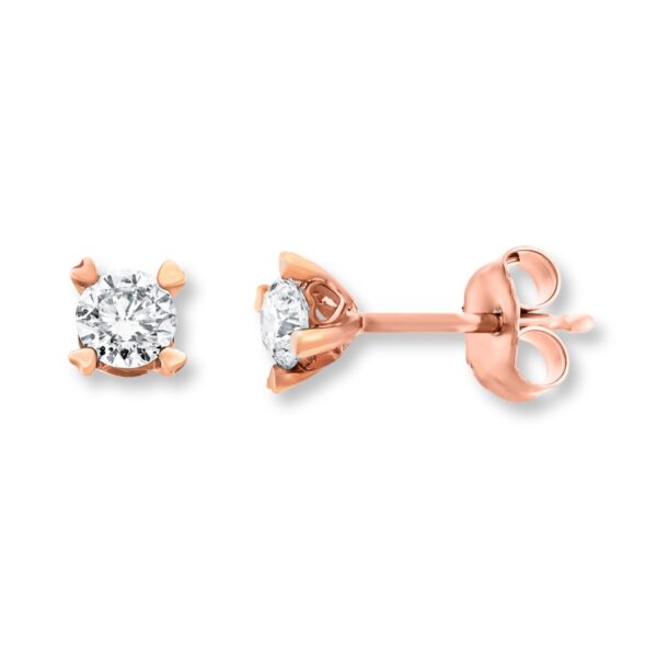 Sparkling round diamonds contrast beautifully with a setting of 14K rose gold with tiny hearts on the side in these breathtaking stud earrings for her. Totaling 1/2 carat weight in diamonds, the earrings fasten with friction backs.