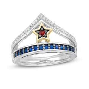 Blue Sapphire, Garnet and Diamond Tiara Ring in Sterling Silver and 10K Gold